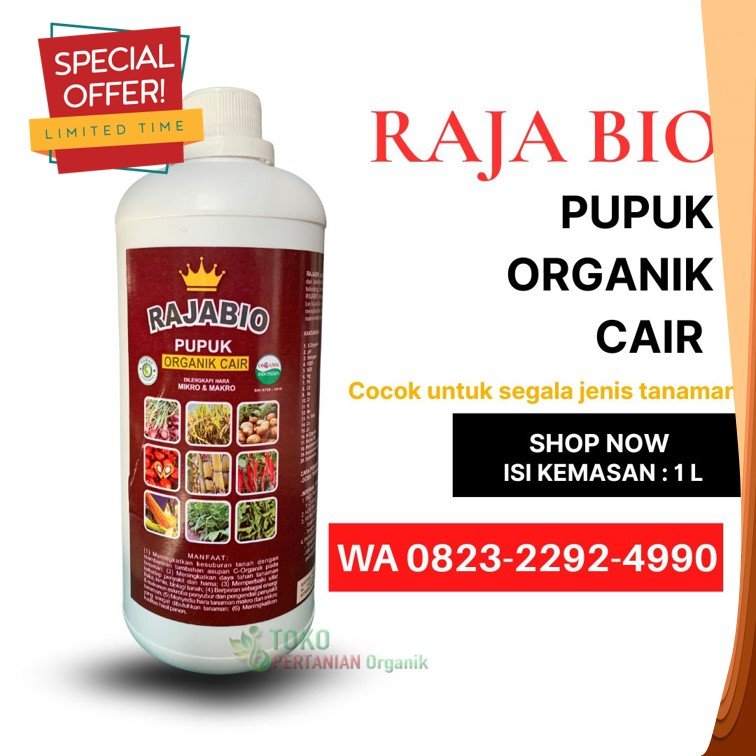 RAJABIO adalah pupuk organik cair diformulasikan dari bahah-bahan alami pilihan, diproses de ngan teknologi fermentasi modern, sehingga pro duk RAJABIO menjadi produk pupuk organik cair yang berkualitas mengandung C-Organik yang me nyuburkan tanah dan mengandung unsur hara ma kro-mikro yang mudah diserap tanaman