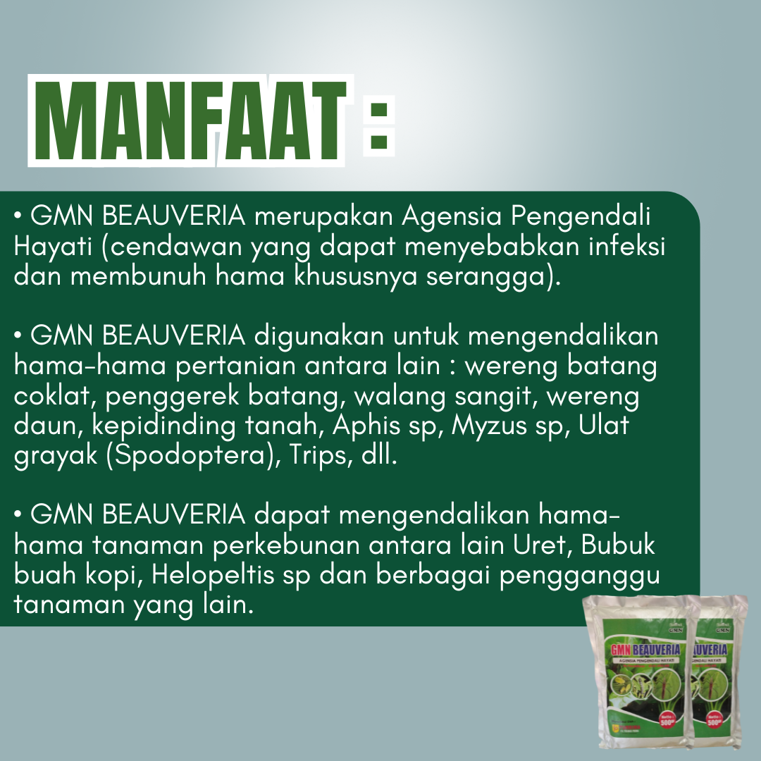 • GMN BEAUVERIA digunakan untuk mengendalikan hama-hama pertanian antara lain : wereng batang coklat, penggerek batang, walang sangit, wereng daun, kepidinding tanah, Aphis sp, Myzus sp, Ulat grayak (Spodoptera), Trips, dll.