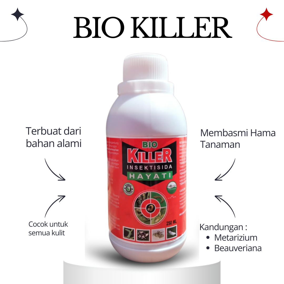 BIOKILLER adalah produk insectisida hayati, mengandung jamur Beauveria bassiana dan Metharizium anisopliae bekerjasama mengendalikan hama-hama perusak tanaman dengan aman. Jamur ini bersifat parasit ( tidak bisa memproduksi makanannya sendiri ) sehingga hidup dari nutrisi inangnya, dengan cara menempel pada kulit, saluran pencernakan, spirakel atau lubang lainnya. Proses selanjutnya jamur berkembangbiak, mengeluarkan toksin dan membunuh serangga