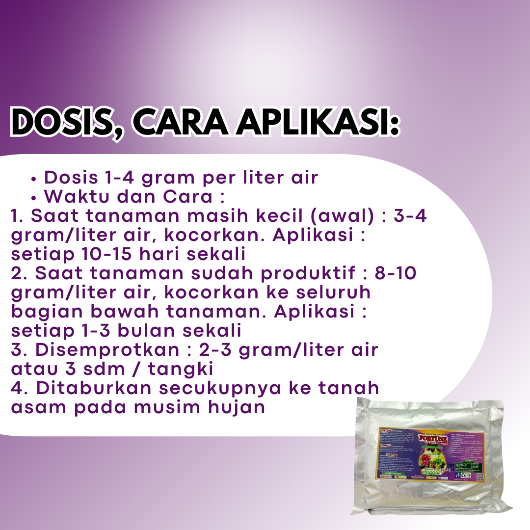 2. Saat tanaman sudah produktif : 8-10 gram/liter air, kocorkan ke seluruh bagian bawah tanaman. Aplikasi : setiap 1-3 bulan sekali