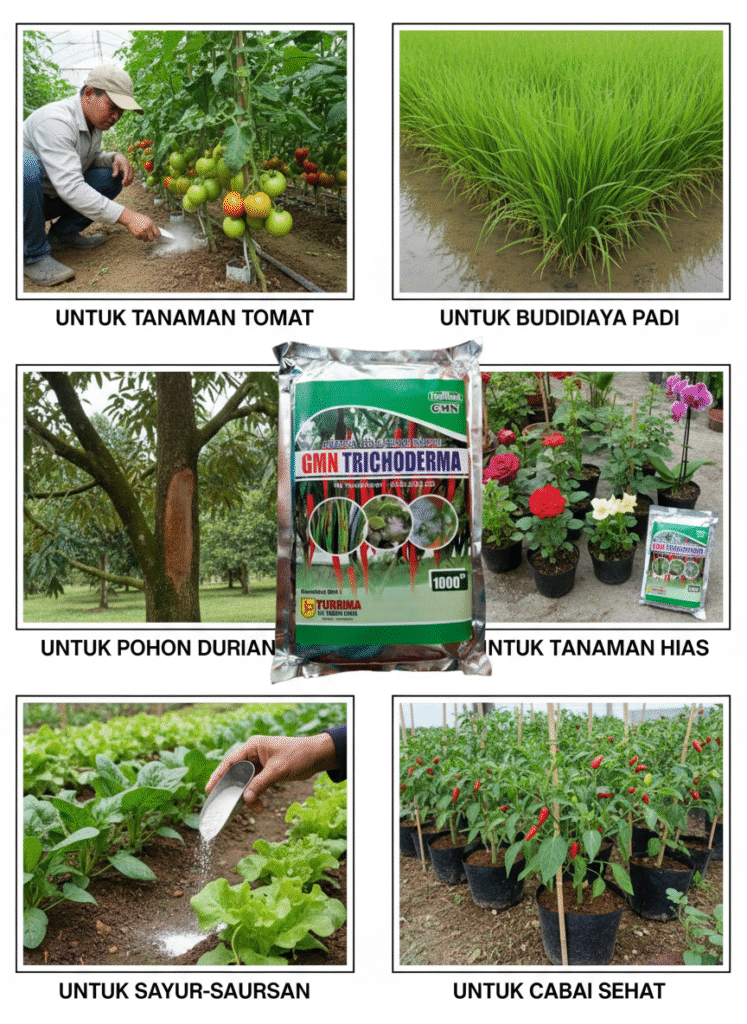 Pemakaian GMN TRICHODERMA antara lain pada tanaman PADI, Jagung, Kedelai dll